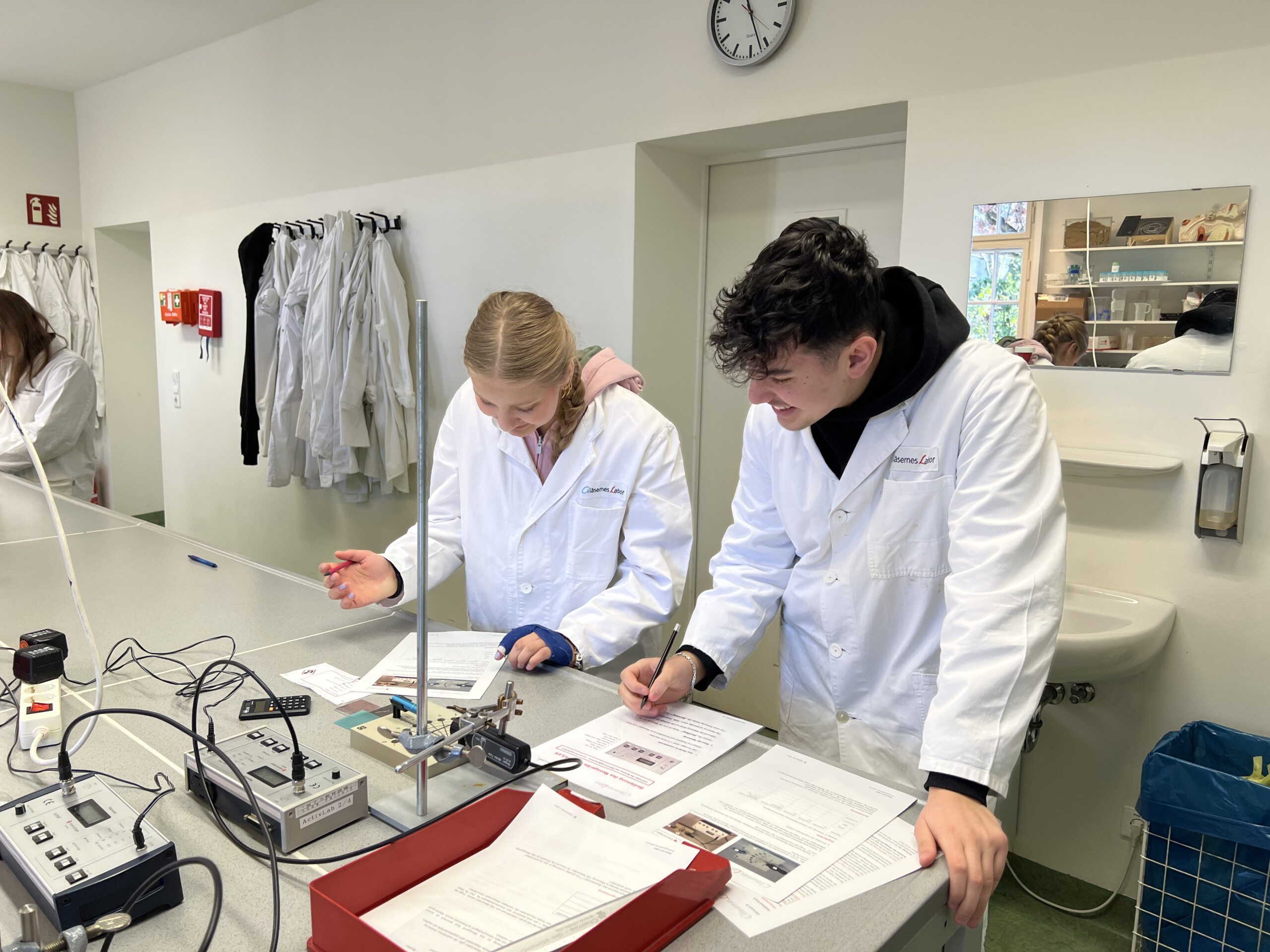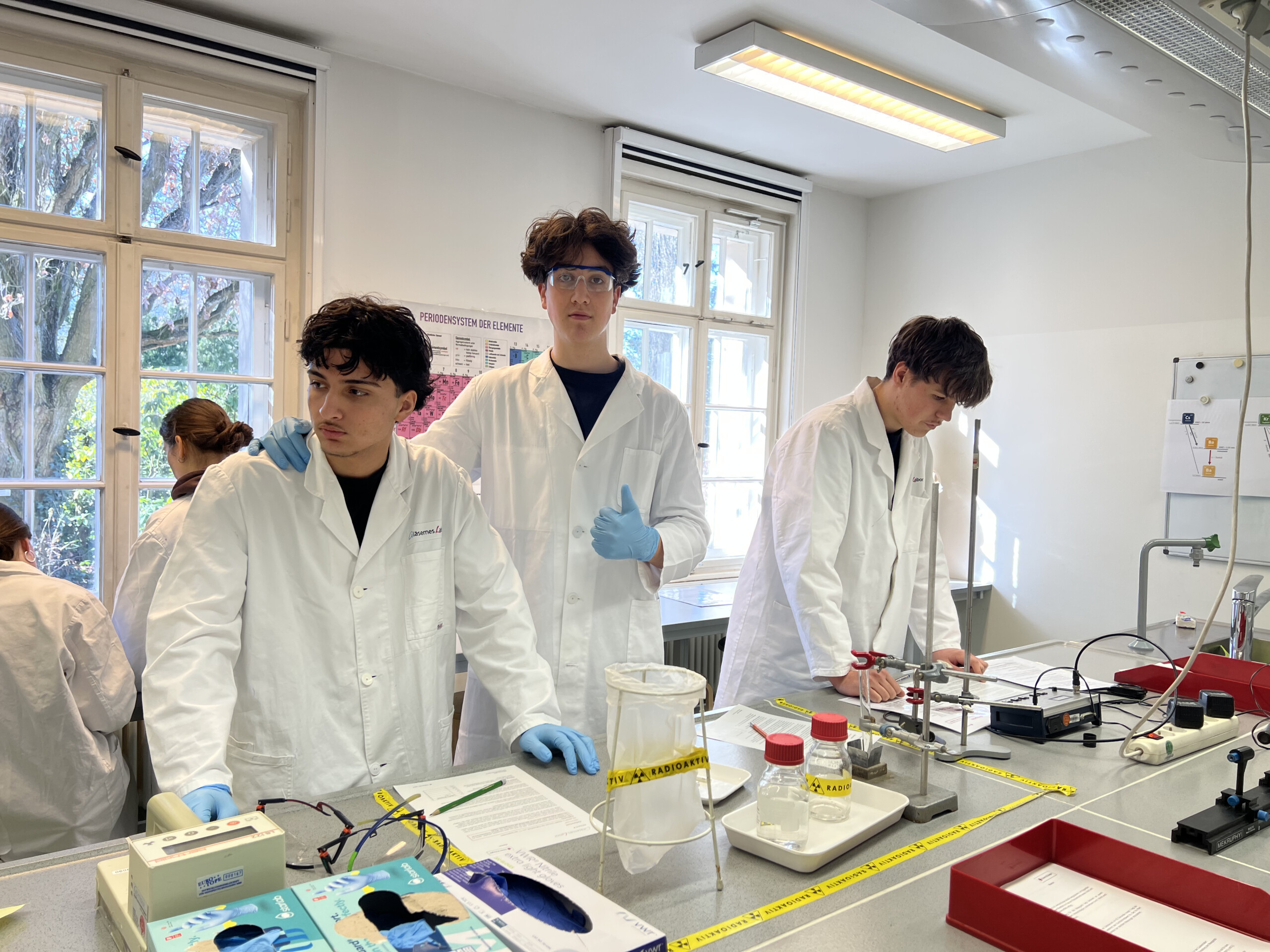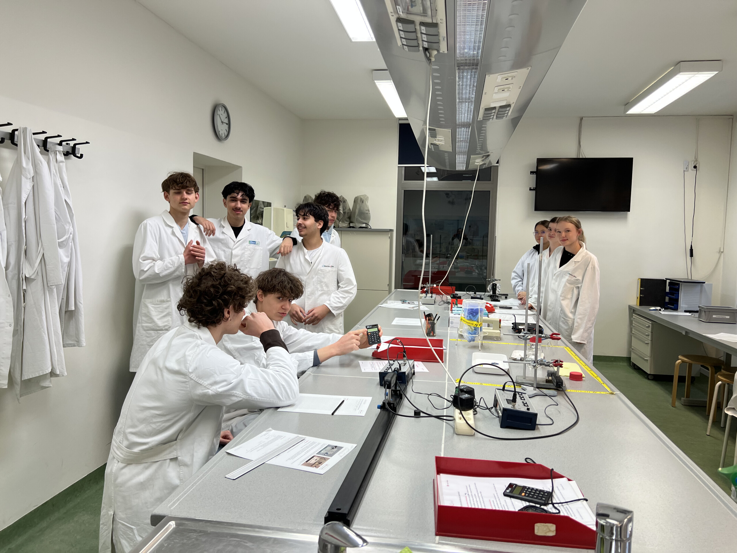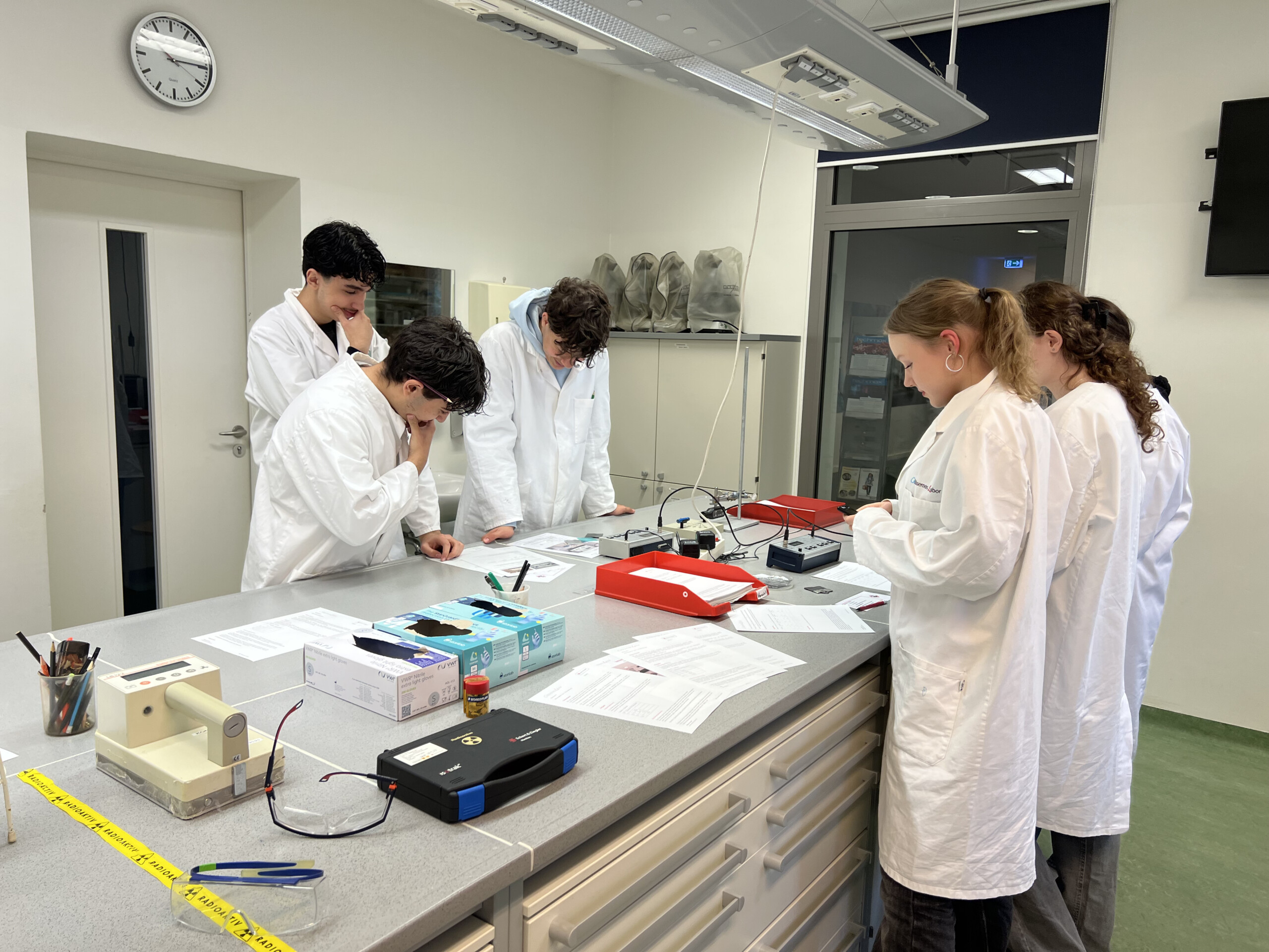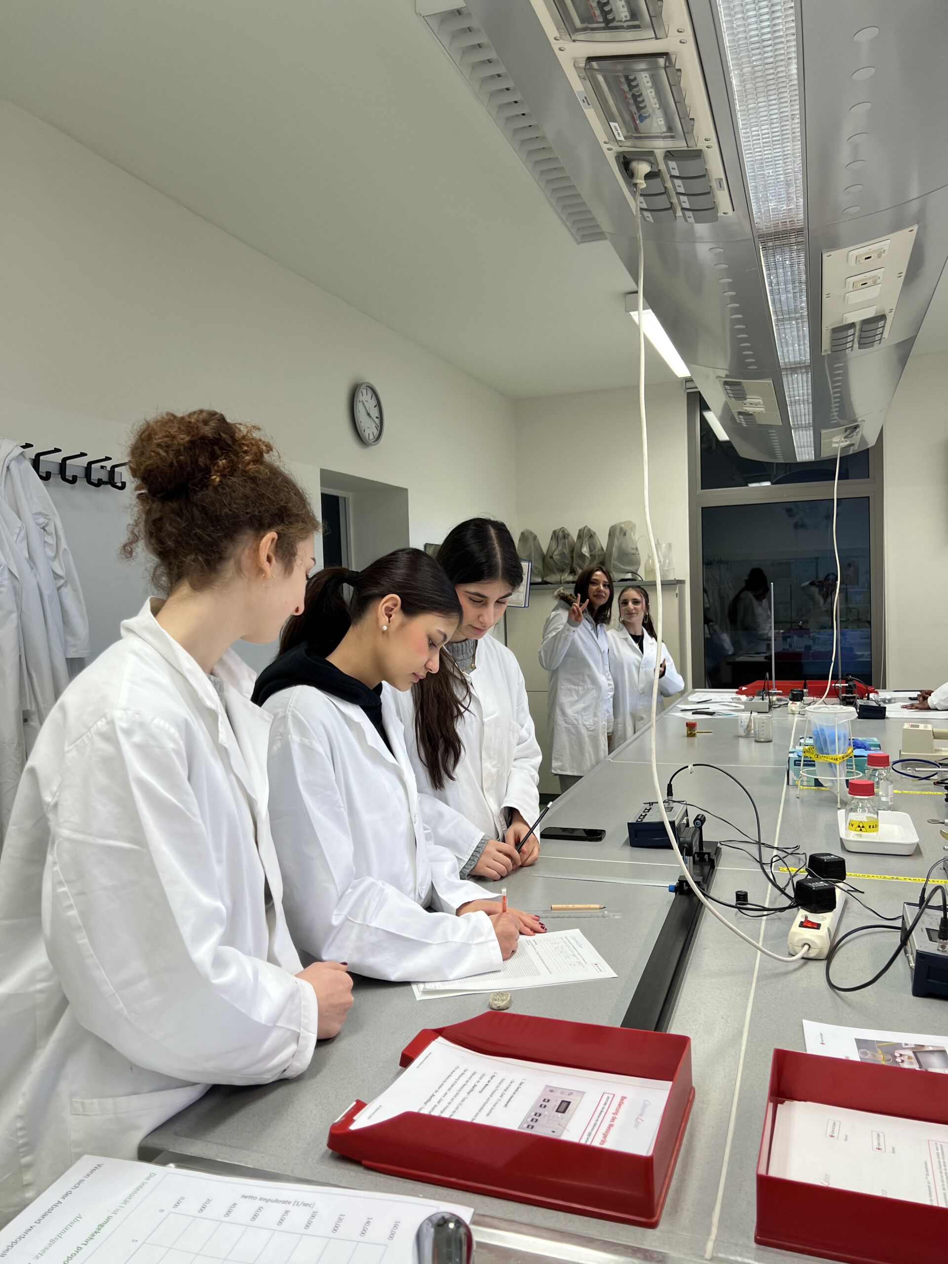 Im Rahmen des Physikunterrichts besuchten alle 10. Klassen im März 2026 das gläserne Labor Buch. Dort konnten die Schülerinnen und Schüler 4 Stunden praktisch arbeiten. Sie führten zahlreiche Experimente zu den Grundlagen radioaktiver Strahlung durch wie Abschirmmöglichkeiten, Abstandsgesetz, Zerfallsgesetz, Ablenkung in magnetischen Feldern aber auch verschiedene Lebensmittel und Leitungswasser aus Berlin und München auf radioaktive Strahlung untersucht und verglichen.