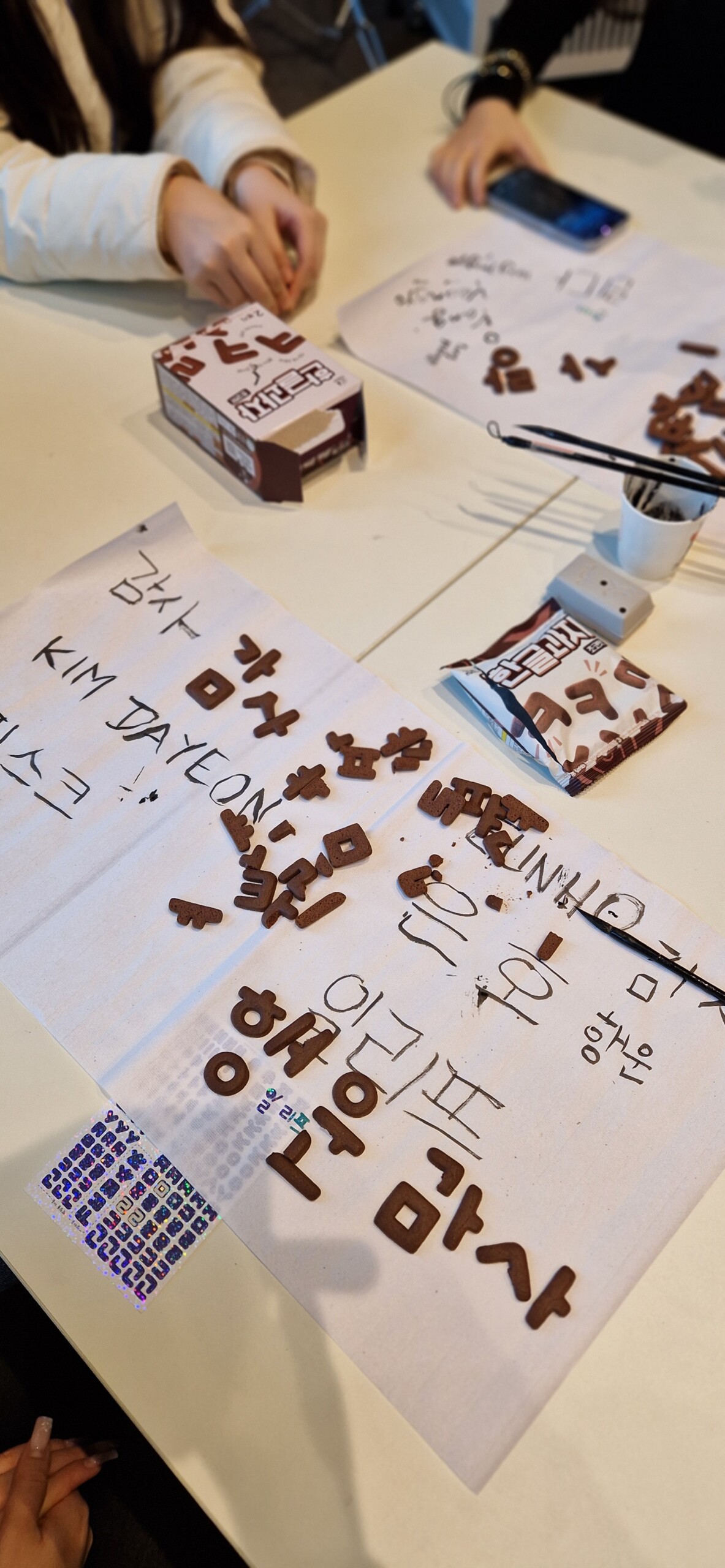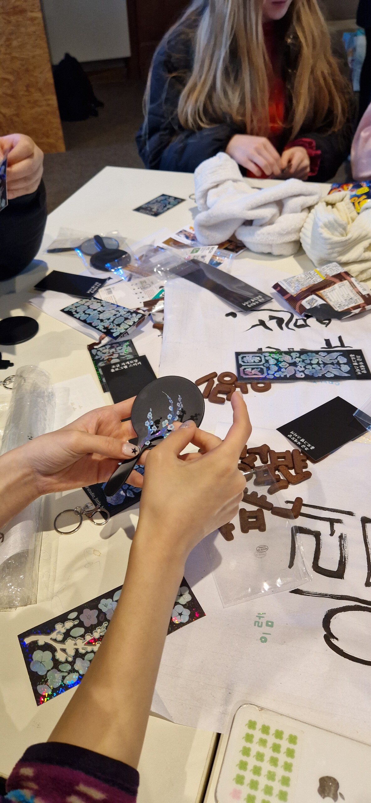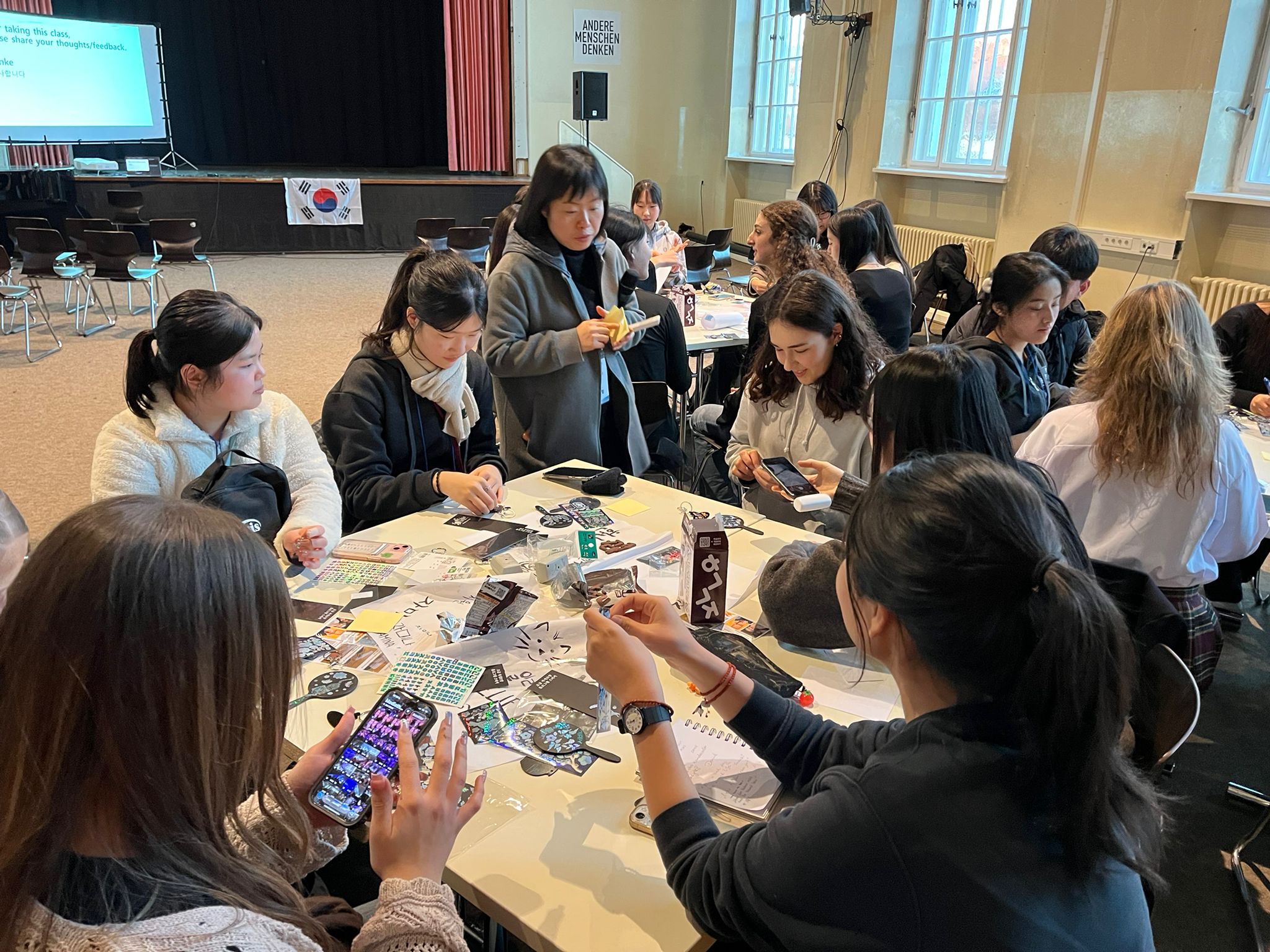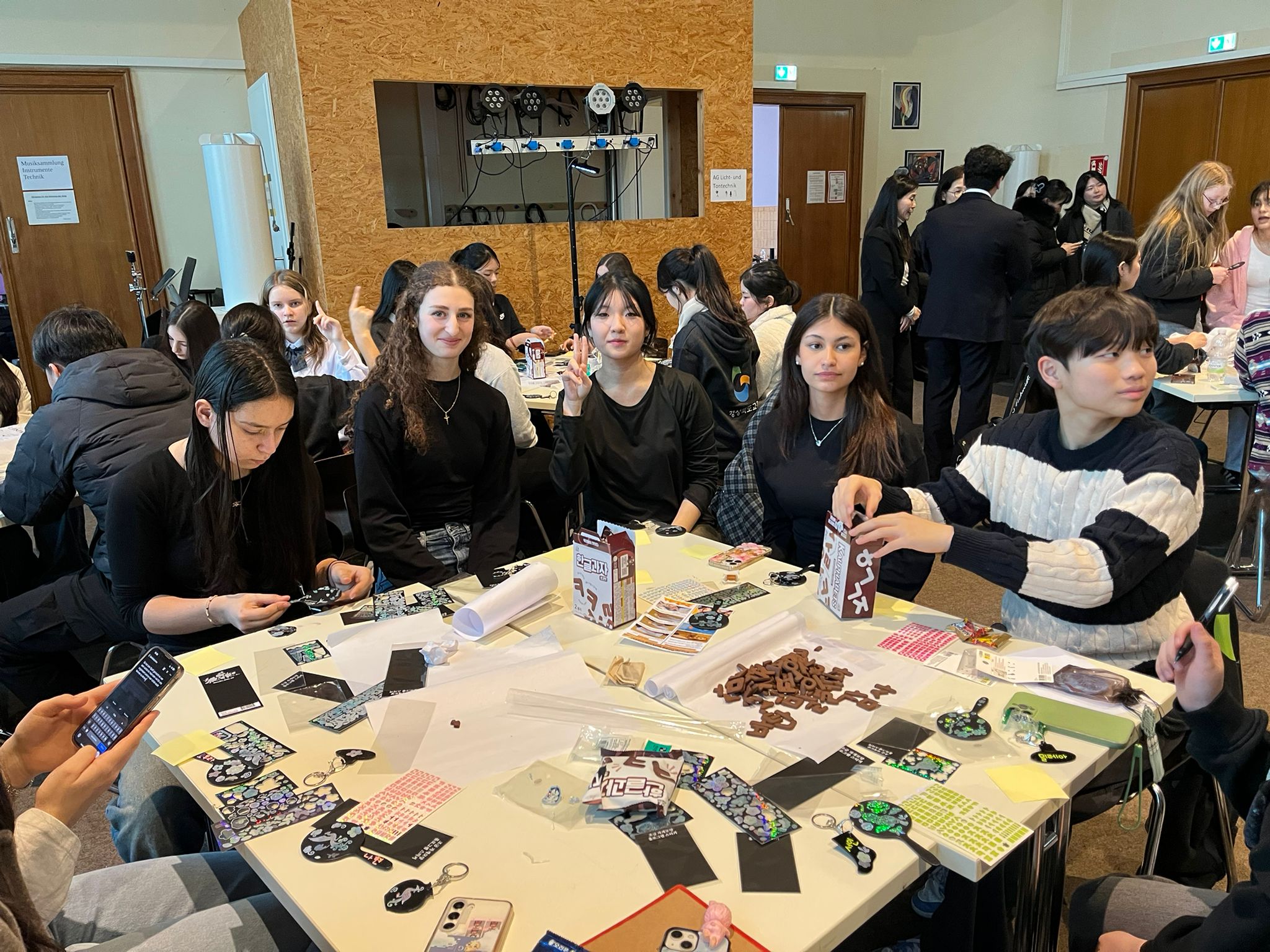 In verschiedenen Workshops lernten wir viel Neues: Wir erfuhren, wie man sich in einer koreanischen Sauna richtig verhält, bekamen Einblicke in die traditionelle Perlmuttarbeit als kunstvolle Holzverzierungstechnik und durften diese selbst kreativ mit Aufklebern im Perlmuttstil ausprobieren. In einem kleinen Kalligrafieworkshop lernten wir außerdem, unsere eigenen Namen auf Koreanisch zu schreiben. Beeindruckt waren wir vom tradtionellen Fächertanz und ein kleines KPOP-Battle gab es auch noch. Ich glaube beide Seiten waren von den Tanzkünsten der koreanischen und deutschen Schüler*innen beeindruckt.