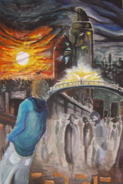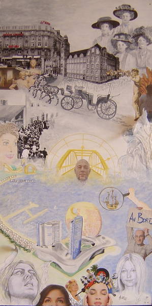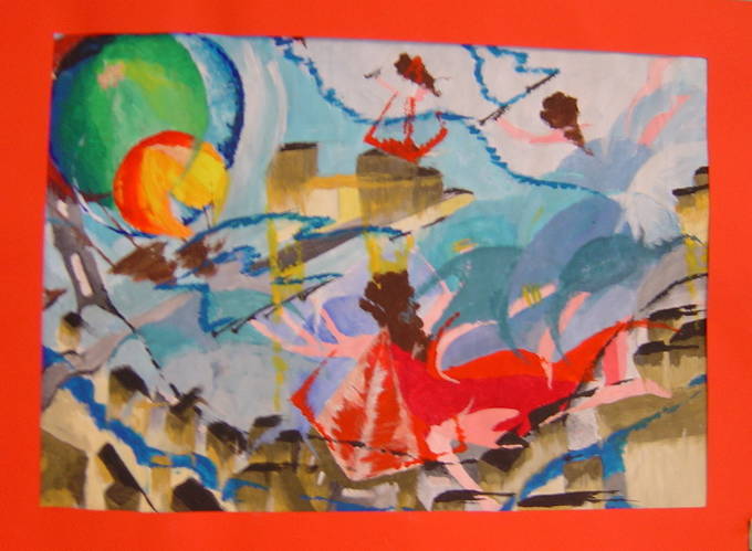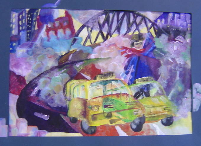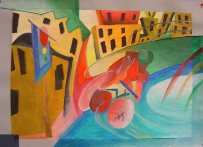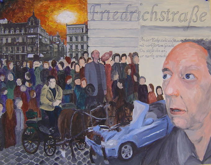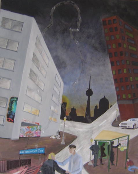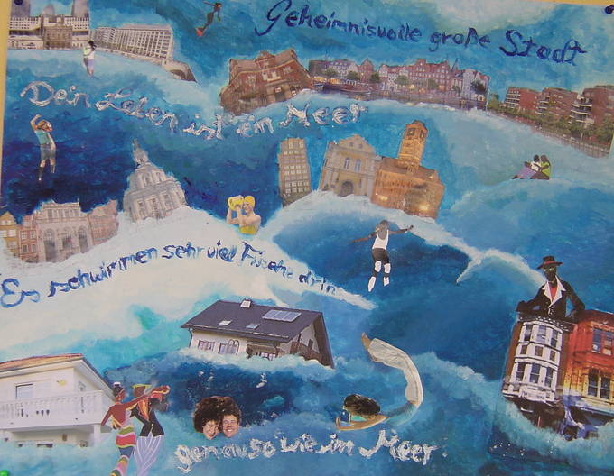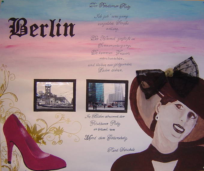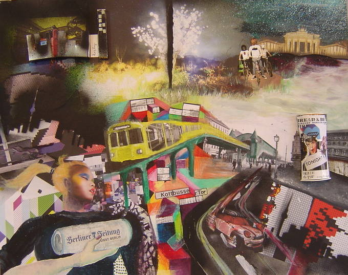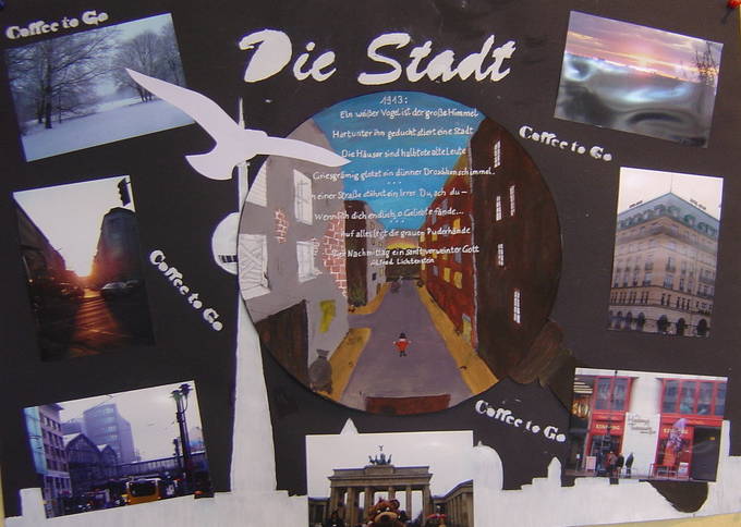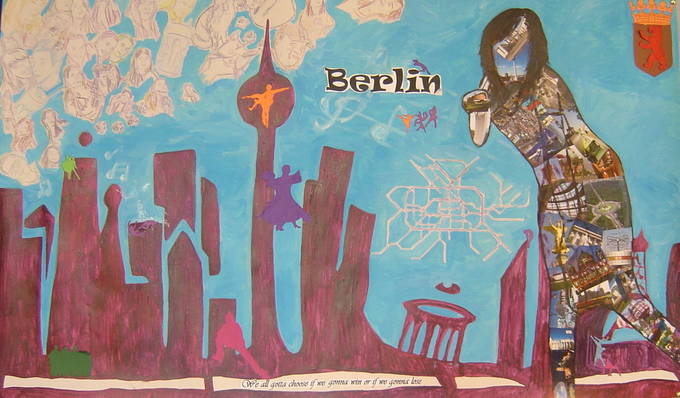 Die besondere Leistung der Schüler bestand hier darin, einzelne, oft unterschiedliche  Textschwerpunkte (positive und negative Seiten des Lebens in Berlin) mit Hilfe verschiedenster Techniken visuell zu einer Einheit (Gesamtbild) zu verschmelzen.